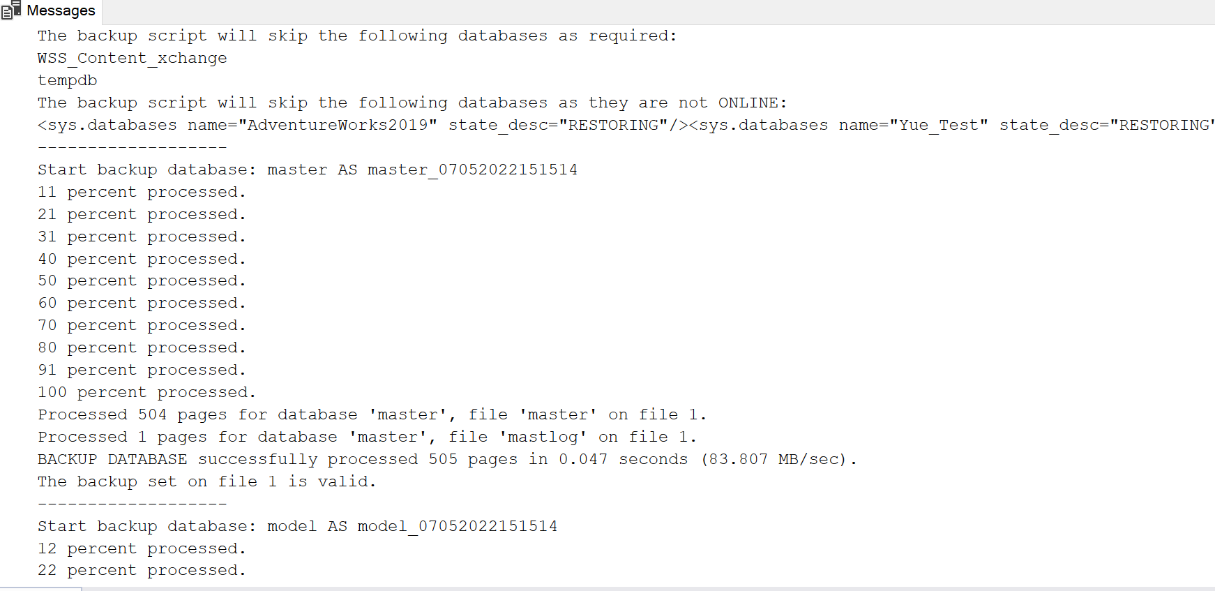 PRINT('The backup script will skip the following databases as required:') PRINT N'WSS_Content_xchange' PRINT N'tempdb' PRINT('The backup script will skip the following databases as they are not ONLINE:') DECLARE @xmltmp xml = (SELECT name, state_desc FROM sys.databases where state_desc <> 'ONLINE' FOR XML AUTO) PRINT CONVERT(NVARCHAR(MAX), @xmltmp)